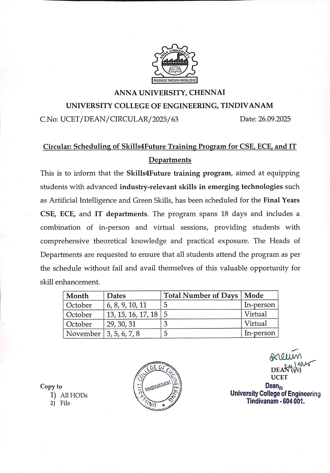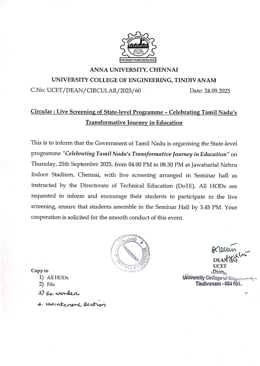 Engineering is not just a degree, but a way of thinking. Even though the number of Engineers in India has proliferated over recent years, the demand for good engineers has remained constant. The first step of being a successful engineer is to have a systematic and efficient learning. It is very important for a student to understand the fundamentals and basic principles of engineering. There is no more important mission for an engineering college than the preparation of its graduates for their careers. At University College of Engineering, Tindivanam, we’re taking on that challenge by broadening the education of our students. We master the technical aspects of engineering at the curriculum’s core and likely add new dimensions that will better prepare the students for the world of today and tomorrow